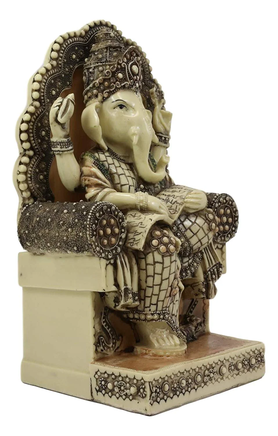 ⢠This detailed Ganesh statue shows the Supreme God Ganapati seated on a throne chair with a rat at his feet. The rat represents greed and our base instincts. Ganesh, the God of wisdom, helps control all the urges that the rat represents. The design is inspired by Balinese Hindu temple sculptures in Indonesia, well know for their expert wood and stone artisans. Ganesha is designed in 'Batik' style clothing carved into the resin body.
