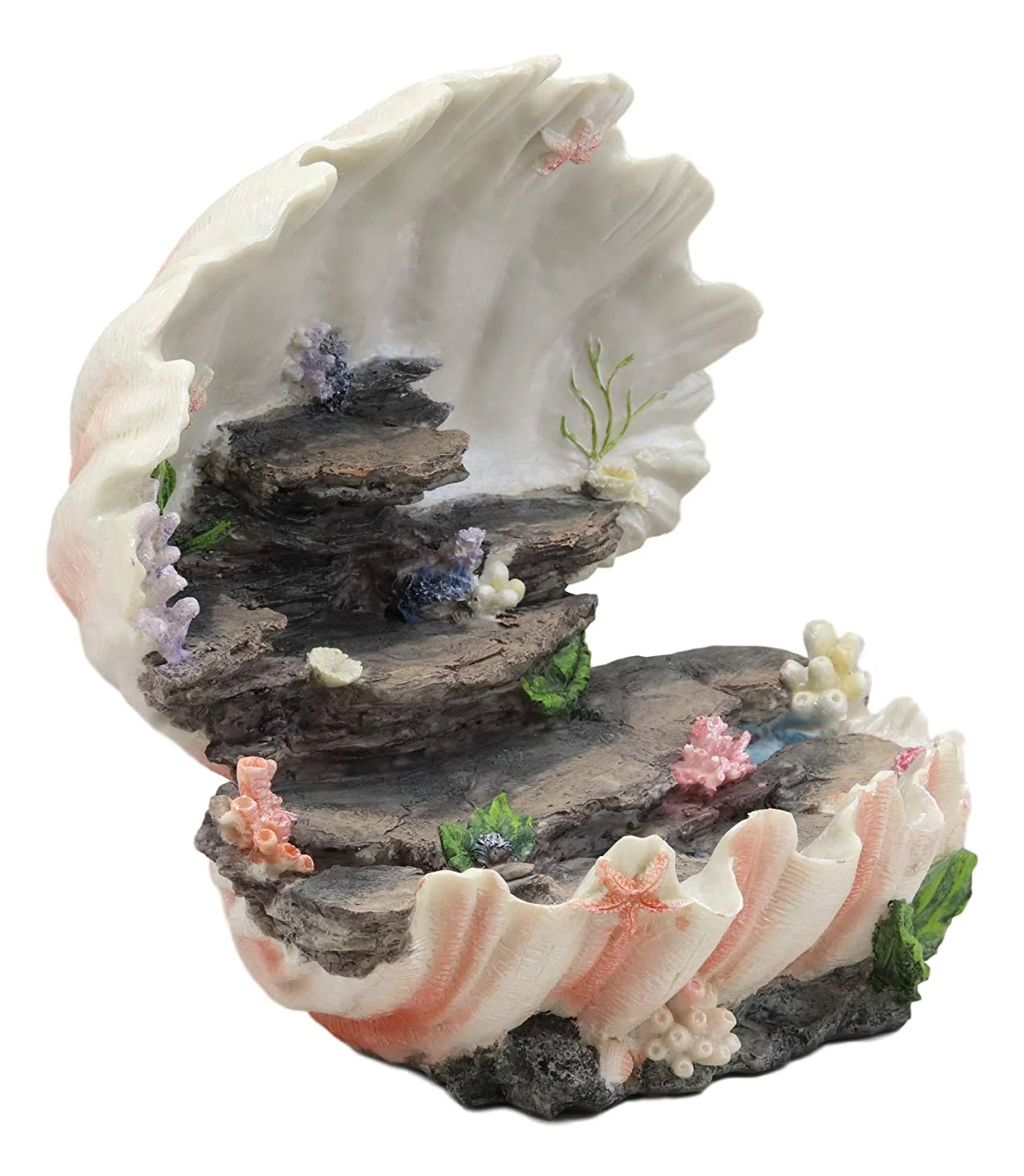 • Uniquely designed with a nautical touch, this giant clam shell opens gracefully to reveal coral reef steps with pretty reef flowers and seaweeds. The steps are designed to display miniature figurines like the mermaids that are available for purchase under this listing variation. The sculpture is hand painted intricately with vivid pastel colors and the craftsmanship of the figurine's details are life like.
