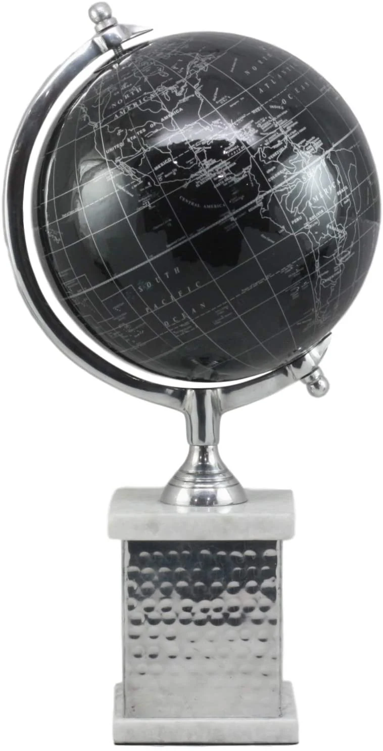 • Decorate your shelves, side tables, desktops, mantle piece or what have you with this Stylish Glamorous World Globe. The Spherical Globe is black based with white/silver contrasting world map design. The base of the globe is designed with two marble pieces to grace the top and bottom with silver finished hammered aluminum pedestal frame. This Globe will add glamour and style to any setting you place it on.