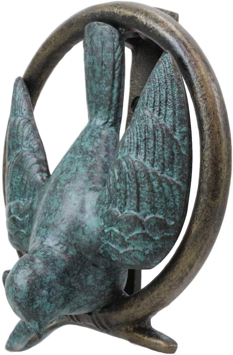 ⢠This pastoral bird in a circle resembles an inverted peace symbol and could pass for a dove that shares the iconic representation. The circular budding branch that the dove is nesting on also resembles the Celtic Claddagh Ring which is a symbol of love and friendship. The bird knocker comes with a built it striking anvil to protect your door from dents and to create a louder knock.
