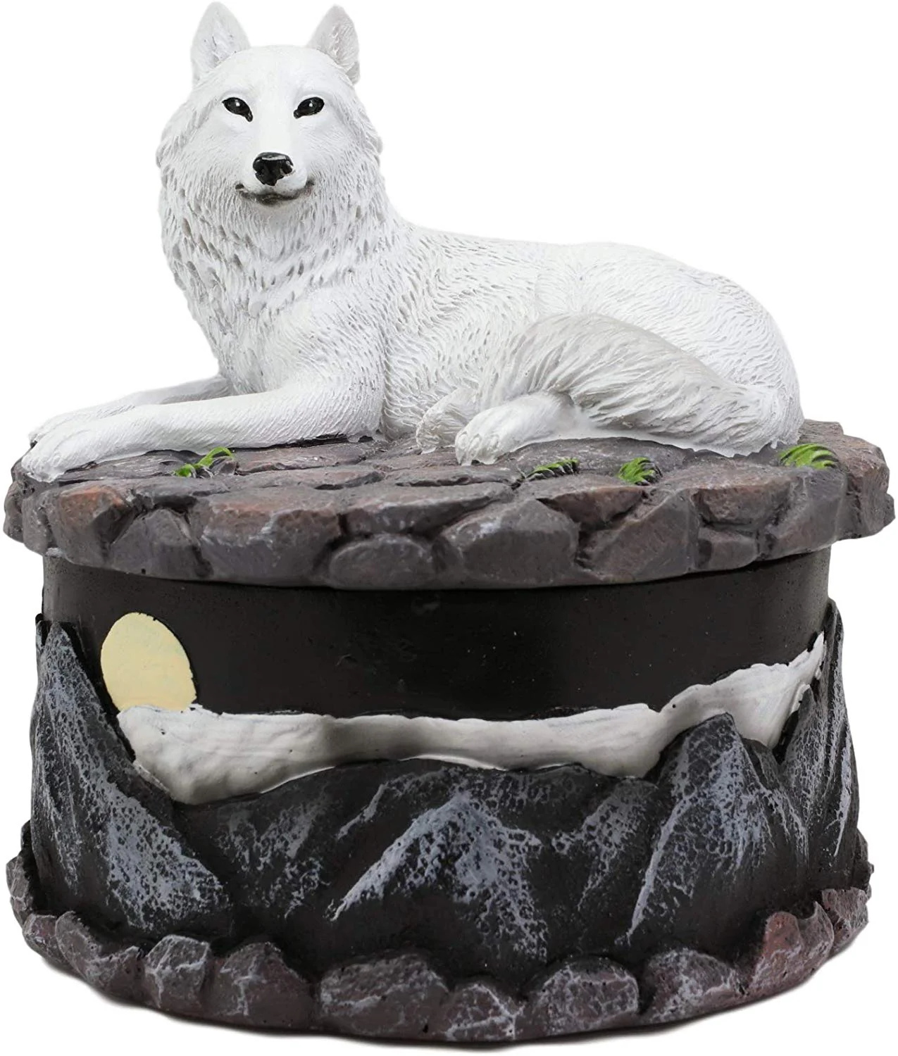 • This Albino White Wolf Round Jewelry Box Figurine is made of designer polyresin, individually hand painted and polished individually.