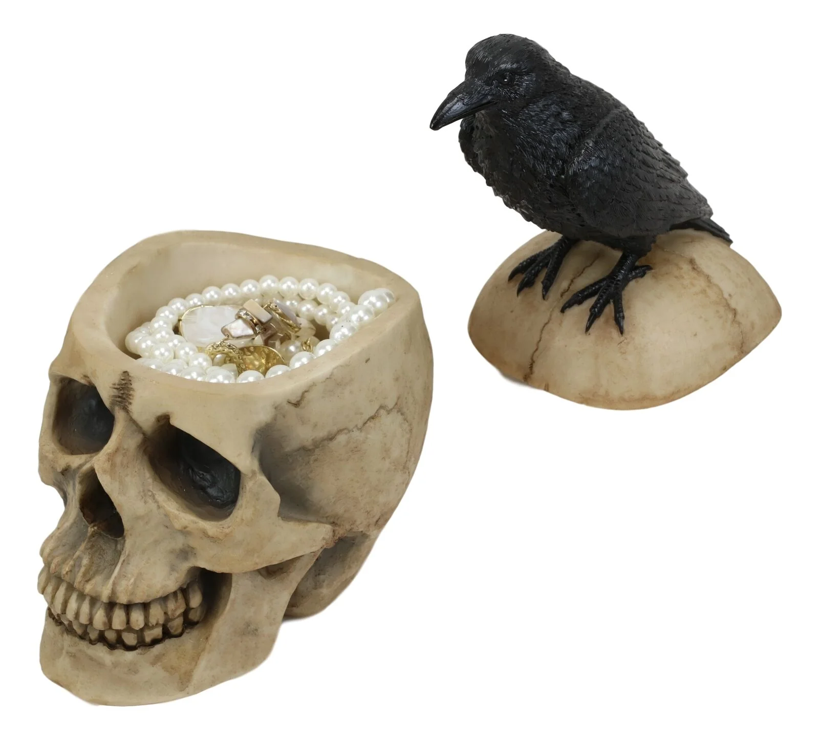 • CLEVER - Need a place to hide your stash? Nevermore! Give a nod to Poe and keep your treasures, jewelry, trinkets, and keepsakes safe in this clever decorative box disguised as a mysterious raven perched atop an ancient skull.