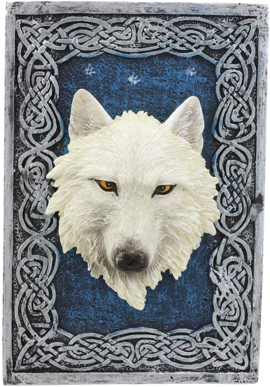 • This exotic celtic wolf decorative box features a striking wolf head of the color Gray or White at the center of the lid. All around it are celtic knotworks in silver gray finish. The wolf head is set against a warm starry night blue background.