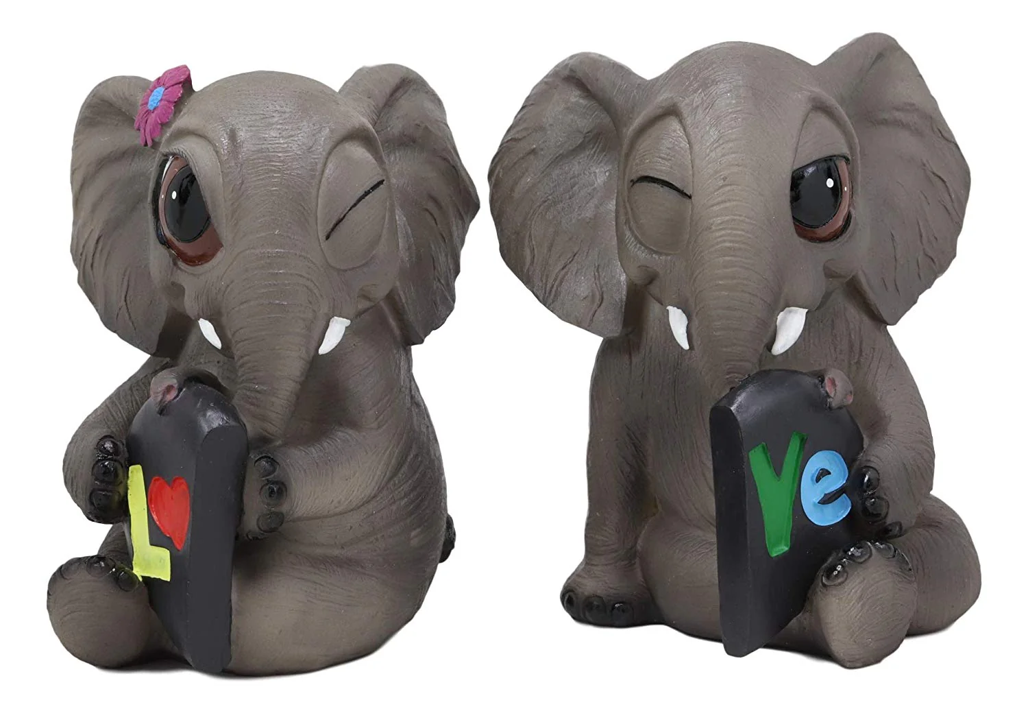 • Two adorable elephants have come together trunk to trunk and hear to heart. They hold a colorful LOVE sign that will fit together nicely only when they are placed trunk to trunk. Each elephant has a wide round adorable eye and a closed eye wink. They make perfect gifts for anniversary, birthdays, Christmas and more!